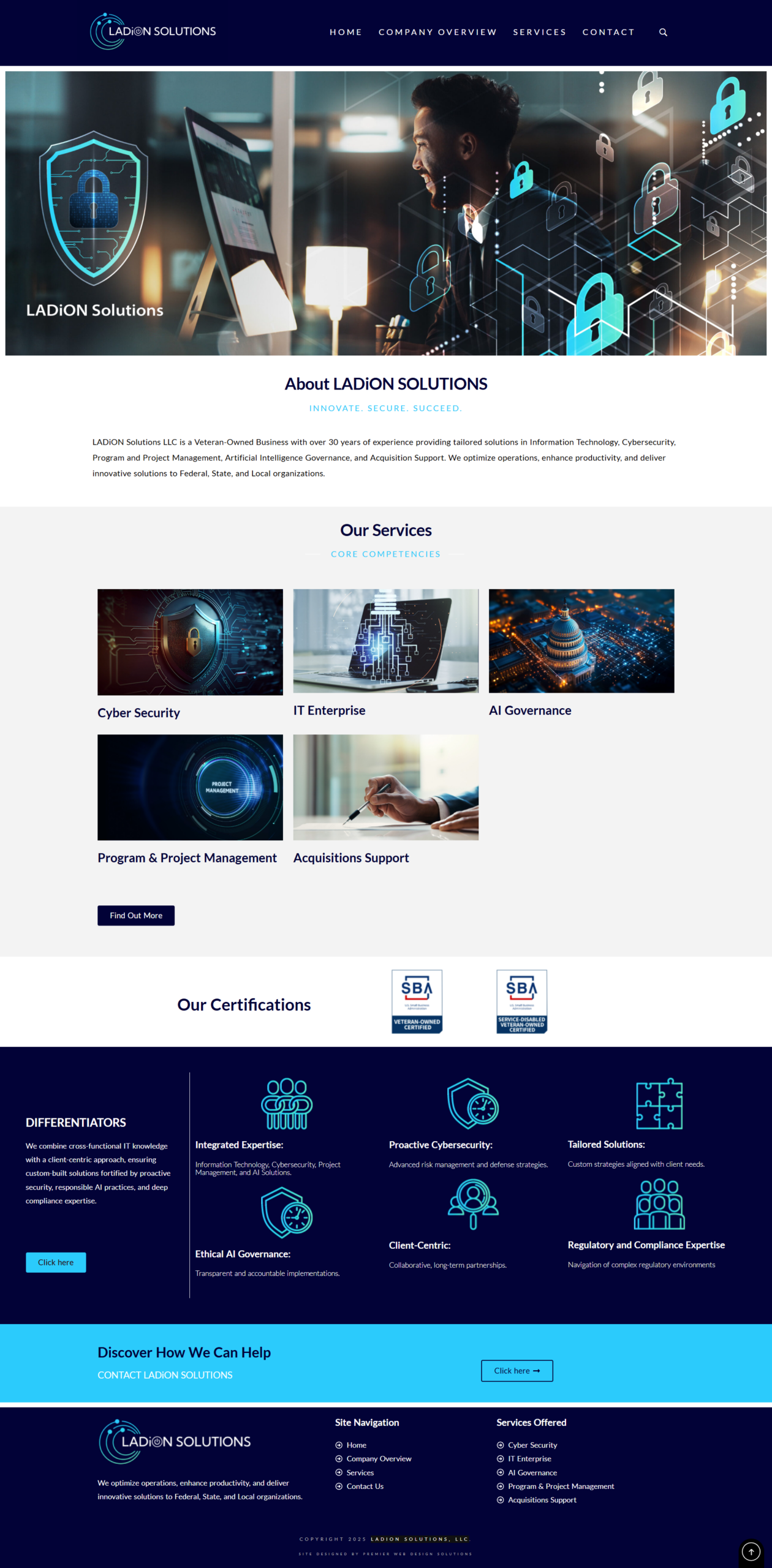 LADiON Solutions LLC is a Veteran‑Owned business with more than 30 years of experience. The company offers services across Information Technology, Cybersecurity, Program and Project Management, Artificial Intelligence Governance, and Acquisition Support, becoming a trusted partner to Federal, State, and Local agencies. Through an integrated‑services model, LADiON Solutions designs and implements customized solutions that not only strengthen organizational defenses through proactive security measures but also embed ethical AI governance and rigorous regulatory compliance at every stage.